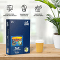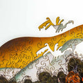 In the details of the puzzle there’s heartwarming sincerity and narrativeness of elements and scenes. Here’s a cheerful tractor man driving slowly, an auntie milking a cow, a guy giving flowers to his beloved. A goat is chewing a flower, a dog is chasing a cat – pets are at their leisure.